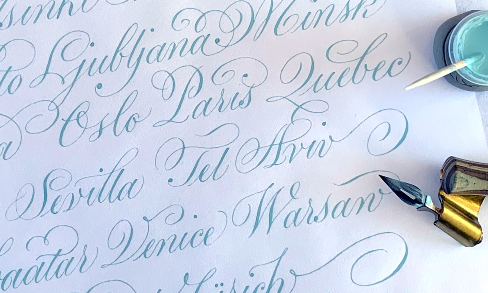Auch Tipps und Tricks zum Layouten mit Kalligrafie sowie zum Schreiben mit einer Vielzahl von Materialien wie Metallic-Wasserfarben, Gouache und weißer Tinte, die ja mit der Spitzfeder etwas herausfordernd sein können, und natürlich individuelles Feedback und die Möglichkeit, Fragen zu stellen, werden durch den zeitlich großzügig bemessenen Rahmen nicht zu kurz kommen.