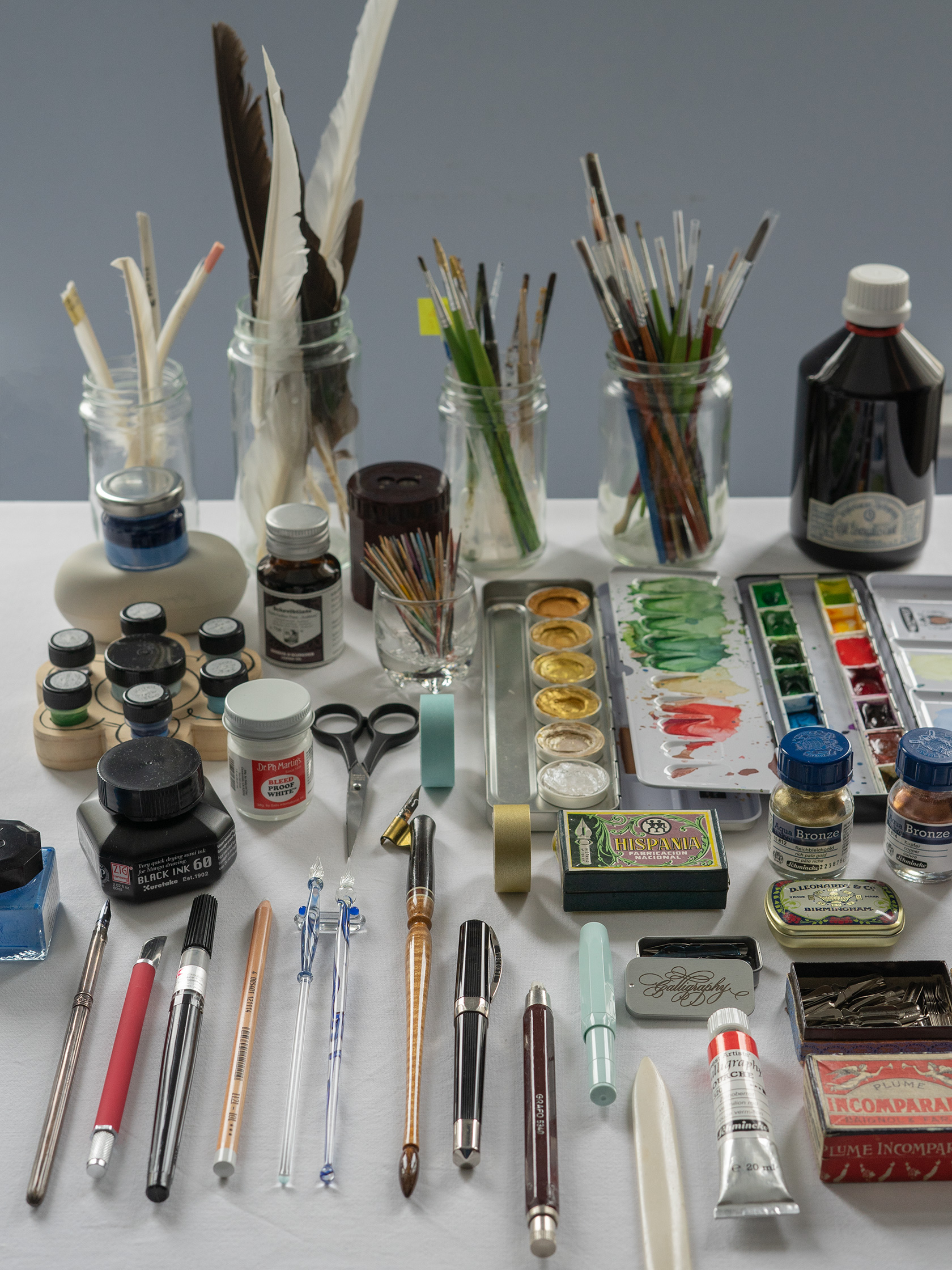 Ob Aquarellfarbe, Gouache, Metallic-Pigmente oder weiße Tinte – wie Sie diese mit der Spitzfeder zum Laufen bekommen, zeige ich ausführlich im Workshop! © für die Fotografie: Ricarda Kopp für Verlag Hermann Schmidt